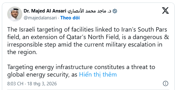 “Việc Israel nhắm mục tiêu vào các cơ sở liên quan đến mỏ Nam Pars của Iran, một phần mở rộng của mỏ Bắc Pars của Qatar, là một bước đi nguy hiểm và vô trách nhiệm trong bối cảnh leo thang quân sự hiện nay trong khu vực . Việc nhắm mục tiêu vào cơ sở hạ tầng năng lượng là mối đe dọa đối với an ninh năng lượng toàn cầu, cũng như đối với người dân trong khu vực và môi trường của nó.”